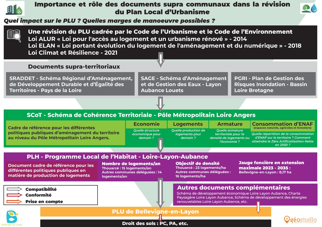 Comme indiqué plus haut, le PLU doit être en adéquation avec d’autres documents d’urbanisme. Les schémas ci-dessous permettent de visualiser ces différents documents et leurs liens :